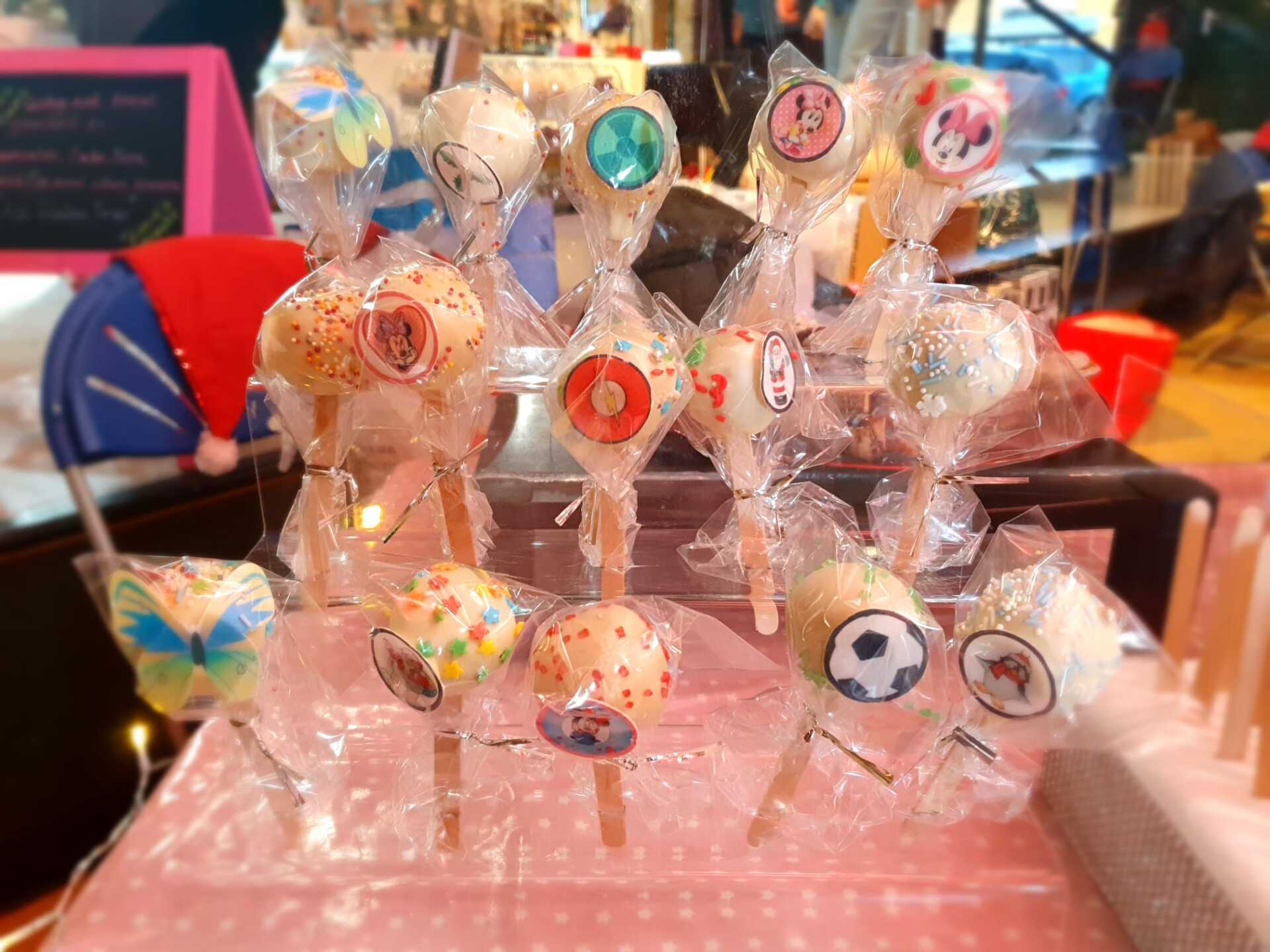 The Cake Pops are balls of vanilla or chocolate sponge covered in melted chocolate and dressed with sprinkles.